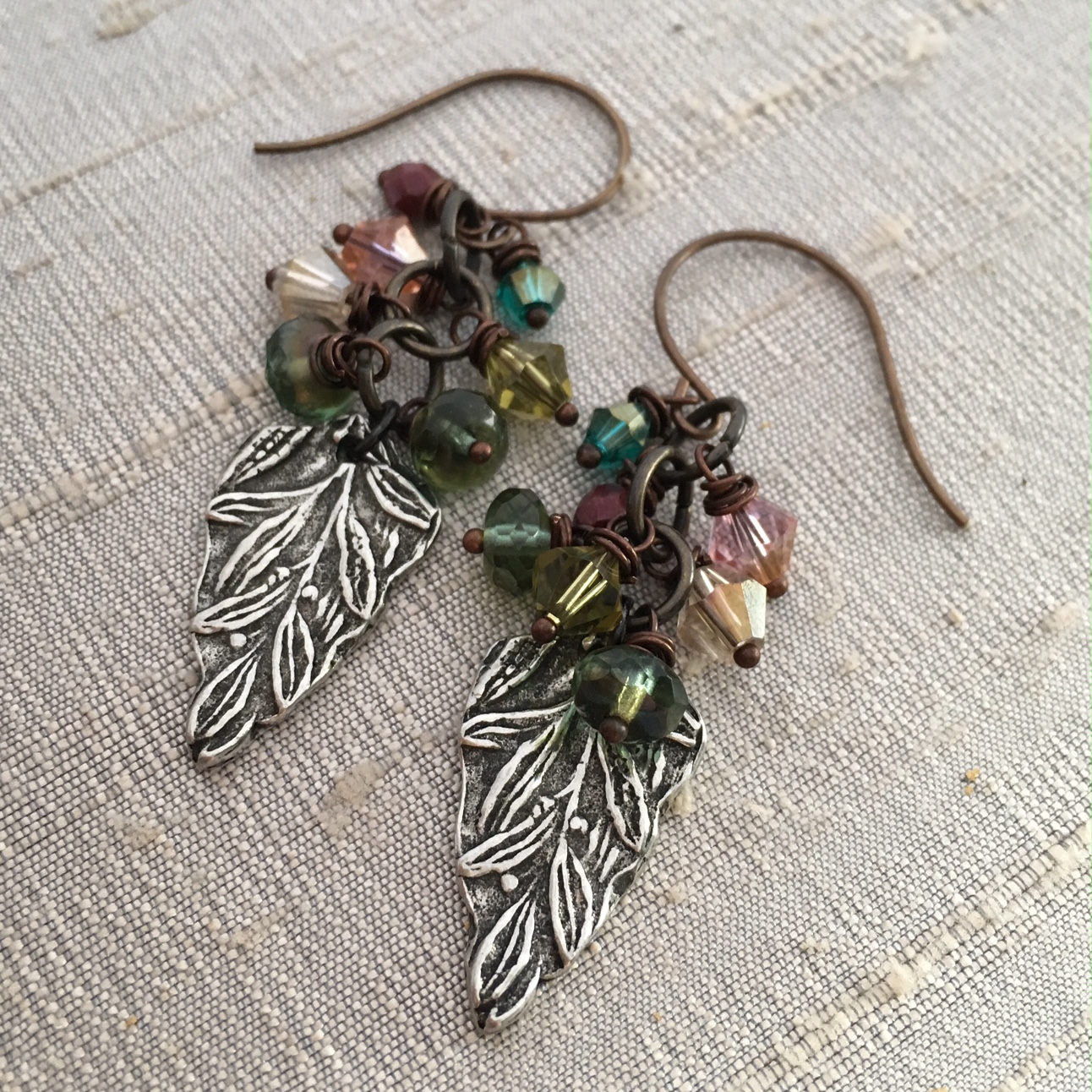 I created these matching earrings using Vine pewter charms. Five 6mm crystals and one 4mm faceted glass and one 4mm crystal on copper ball headpins. I attached two 6mm crystals to an 8mm jump ring, attached another 8mm jump ring with two more 6mm crystals, one more 6mm jump ring with one 6mm crystal and one 4mm faceted glass bead. I attached the earwire and include one 4mm jump ring on the earwire to dangle in the front. I attached the charms to the bottom with 5mm jump rings.