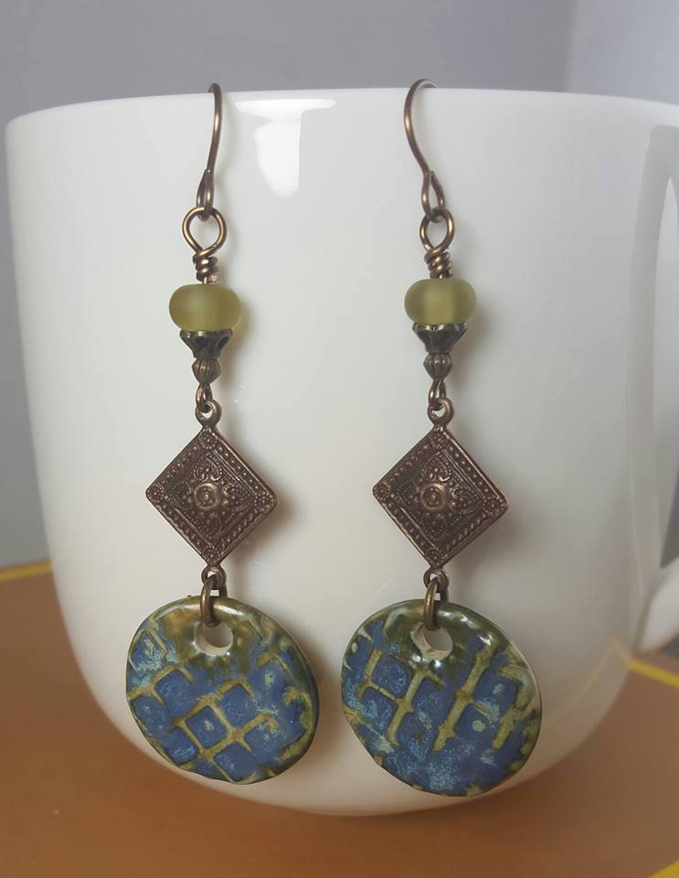 As I’m sure you are guessing, I could share weenie bead creations with you all day, but just one more – from Sarah Ostriyznick of Sarah O Creations. Timelessly elegant, these feel so perfect for fall! She used a pair of etched transparent olive weenie beads, perfectly complementing the stunning ceramic disks by Mari Carmen of Majoyoal: