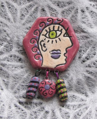 Tari Sasser of Creative Impressions In Clay has donated a pendant (1 7/8″ x 1 1/2″) with 3 charms dangling from the bottom. Tari’s Fun, Funky & Functional buttons are made with a low fire white clay and brightly colored underglazes.