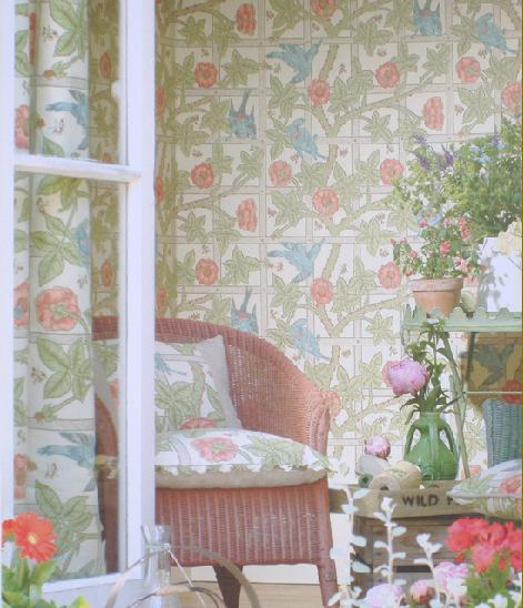 | {This room shows the Trellis fabric and wallpaper in an alternate colorway. It looks so lush and tropical.} |