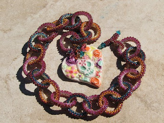 Aardvark art glass repost: with my hand-made sterling 3 in 3 necklace, I teamed up with Cathy Lybarger, an amazing glass artist, as she experimented with painting on the insides of her hot glass beads, using enamel! This is now in my Links chain maille gallery on my site!