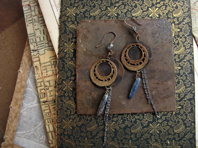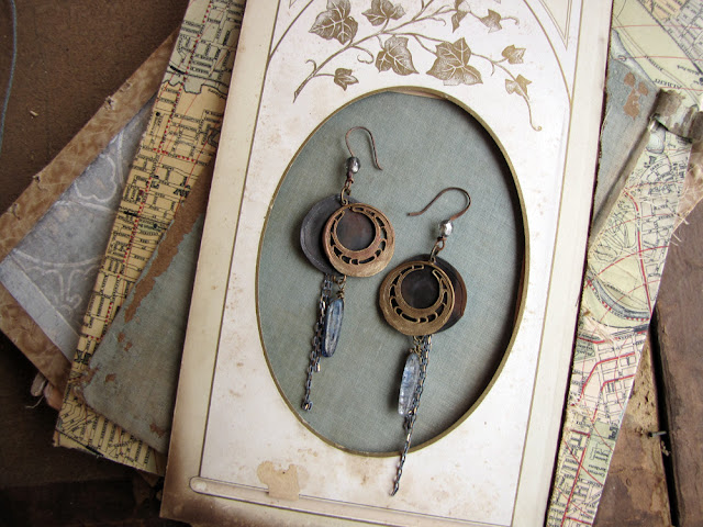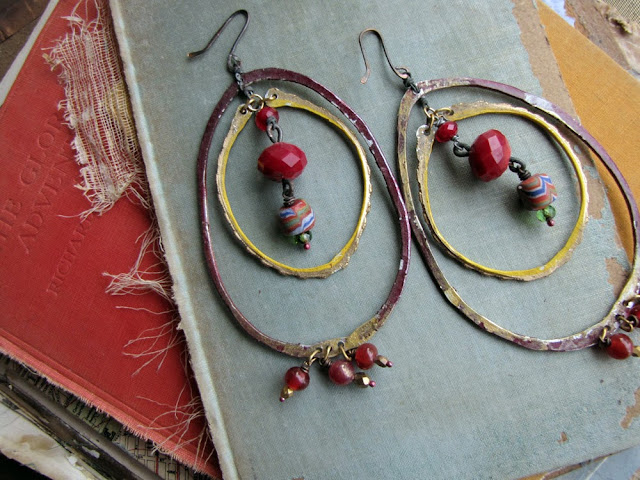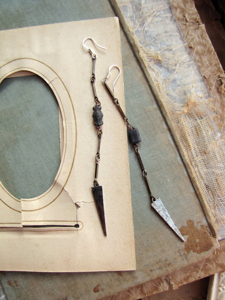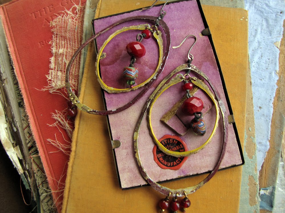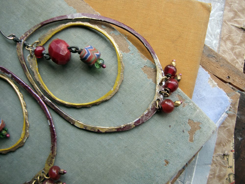 In order to pick the best background for your product, you have to first do what I’m always telling you to do – know your market! Figure out who’s most likely to buy your goods and market them accordingly. This of course may change over time, but as an example, in all the styles I’ve gone through there’s a strong theme of romance, because I make romantic jewelry. Even if your jewelry doesn’t look particularly ‘of a style’, you can still make it so- from coloured enamel beads to one of a kind vintage assemblage. Here’s a pair of earrings I made in as modern a way as I can manage: