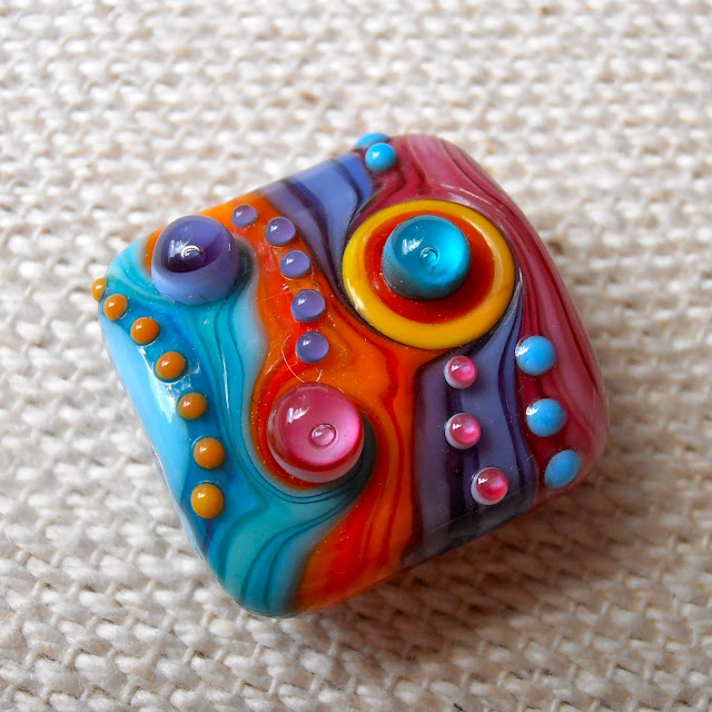 It’s beautiful as it is. You look at it and see wonderful composition, gorgeous colours, lovely shading, and do not question the mixture of colours here. In the most simple colour terms (I’m not afraid of simple!), we have blue, red and yellow, with even a little green. When I started to work with a bead like this, I would see how the artist fearlessly mixed colour, and how IT WORKED. It also gives an idea of colour proportion – mainly blue, with quite a bit of red, a touch of yellow and a hint of green. Although having seen these colours together – having held these colours in my hand! – I would then try mixing them in different ways and proportions for other projects. So I would sit down with my beads, and pull out beads that matched. They didn’t have to match precisely but closely. And once I had my colours in front of me, I could create and play safely with my little bead palette, knowing that these colours did indeed go. If I have art beads in colours that are perhaps unusual for me, this is still where I will start. Once you start working like this, you will find your colour confidence will grow hugely. I store my (non-art) beads in boxes according to size now, as I love to see the colours mixed together and pull out the palettes that either I conjure up by mixing the beads on my table in front of me.