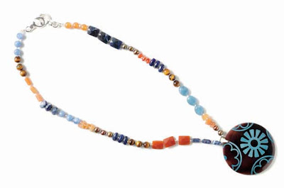 I like to support other women who are trying to make a living by making their art, so my stash contains all kinds of art beads made by talented gals: ceramic beads from Earthenwood Studio & Jangles, silk beads from Kristal Wick, stained glass pendants from Lily Studios, lampworked glass beads from Stephanie Sersich, polymer clay pendants from Heather Wynn, pewter beads from Green Girl Studio, engraved shell pendants from Lillypilly Designs. I like to use dramatic art beads as the focus and then fill in the design with a variety of semiprecious, crystal, Czech glass and other mass-produced beads.