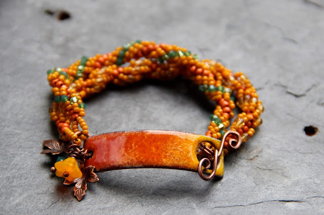 Oh, the color! It grabbed me and said hello! The rich, saturated tones of autumn come alive in this bracelet by Karin of Gingko et Coquelicot. The russet, the tangerine, the sage and the gold are all melted together in this bracelet that looks like the sun swirled all these colors together and poured them onto your arm. Perfect for a pop of color during sweater weather!