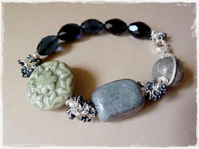 “With the simple addition of jump rings and seed beads Tracy brings movement and interest to her beautiful beaded bracelet. She also created the illusion of movement with her asymmetrical design. The color palette is a lovely nod to our inspiration painting. You can read more about Tracy’s design idea behind her bracelet on her blog.”