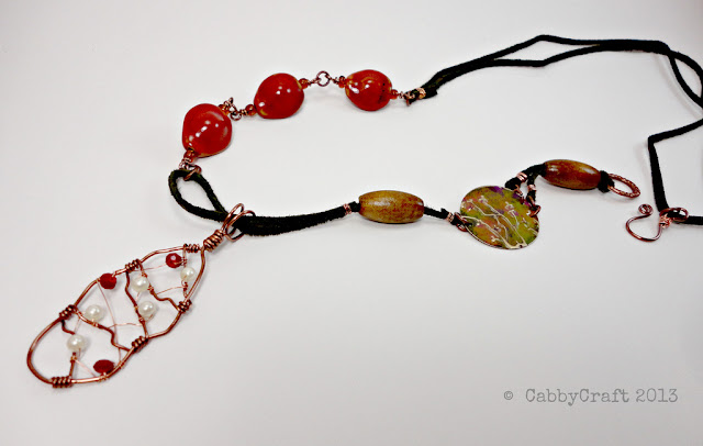 OOPS! I forgot to include Susan McClelland’s beautiful necklace over at M is the Word. I like the mix of textures in this beautiful necklace, from the white gems that hint at the end of winter to the rough river stones that feel very zen-garden to me and the beautiful poppy red of the focal bead on an embellished ribbon beaded chain. Despite being struck by the dreaded ick in her house she managed to create something lovely!