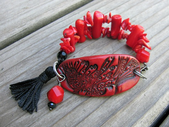 The strong red color in this painting is so dominant that it is hard to see past it, and I am so glad that Miss Emma of Fresh Baked Designs (above) focused on this rich color for her monochromatic look. The beautiful faux cinnabar bracelet connector is such a strong statement piece and is perfect for this inspiration.