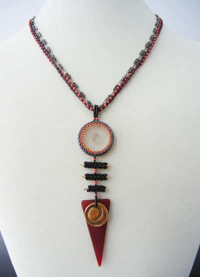Karin of Backstory Beads (above) created a bold statement necklace that has a definite Asian flair. I love the strong lines and shapes in this necklace and the colors and layers of elements are so well combined. Beautiful!