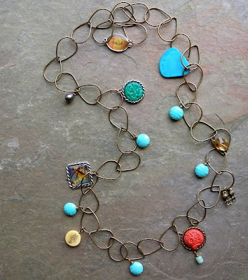 With these sets, I created a long charm necklace using some large teadrop link chain, and added some wire wrapped faceted lucite coins in a coordinating teal color.
