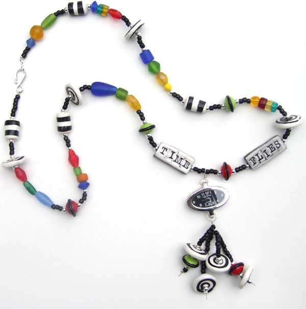 - String on the time bead, making sure the “T” end of the bead goes on the wire first. String a silver ball, three seed beads and then the watch. You can decide which way you would like the watch face going. You might need to twist the wire loop to get the face to lie flat. After the watch is on the wire, string three seed beads, a silver ball, red saturn, silver ball, three seed beads, a silver ball, and then the word “Flies”. This time make sure the “F” goes onto the wire first. Double check before going any further that the words can be read the right way when your necklace is on.