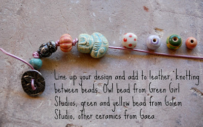 My hands are frozen and my lips are chapped! We have had one day of rain and 1 week of winter weather, if you can call 65 degrees as a daytime high “winter” (and I do), and this So. California gal is ready for a bit of spring. Ignore all that complaining I did back in August about how meltingly hot it was, I didn’t know what I was talking about! So, with hot coffee in hand I attempted to unfurl my frozen fingers and create a Funky Fungi bracelet. Not so easy to knot leather cord with these frozen hands but I digress…