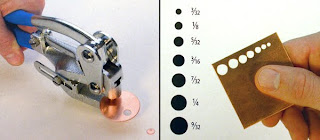 The Euro-Power Punch makes 7 different hole sizes and will punch metal up to 16 gauge. That will cover most metal that the average metalsmith uses. According to the Rings n Things website, “Adjustable throat allows you to place holes up to 2″ from edge” giving you enough room to use on most jewelry sized metal blanks.