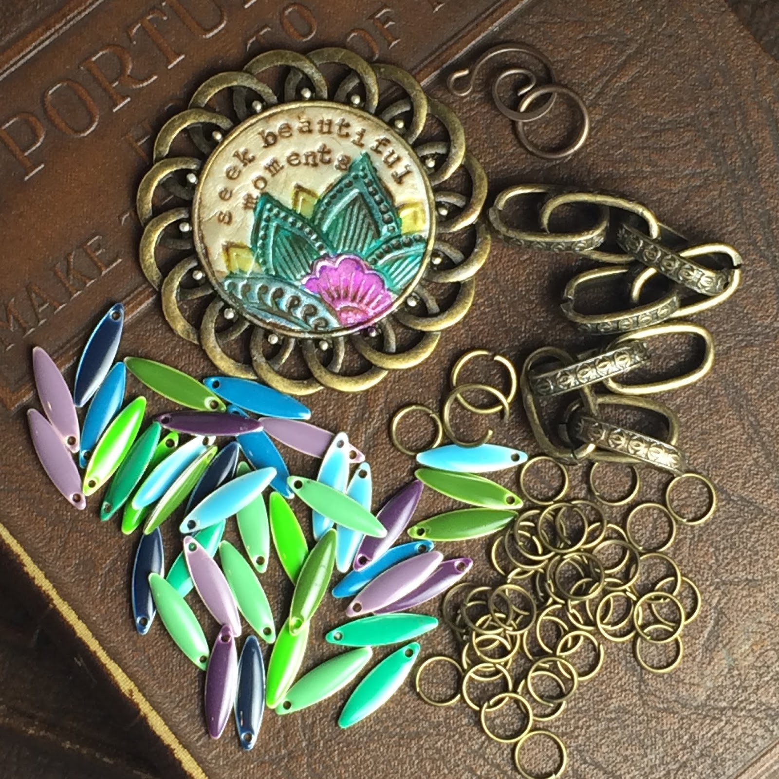 The other kit I am making is a based on my own design featured in the upcoming Create Jewelry magazine. (I can’t wait to get my copy of this! It is always a highlight of my year!) Their themes are based on color and one of the pieces that I submitted is called “Seek Beautiful Moments” for their Warm Hues section. Since the focal is only available from me, I thought that a kit would be a good idea.