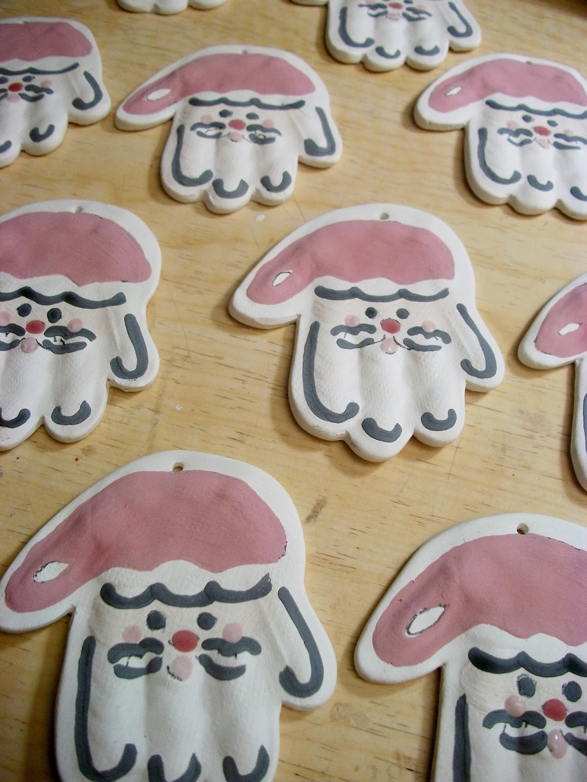 The next project I tackled was making my granddaughter Summer’s first Christmas ornament. I made a mold with her hand, pressed the clay into it, and used an exact knife to cut the shape. Here they are fired into bisque and I used a pencil to sketch out the design (it burns off during firing).