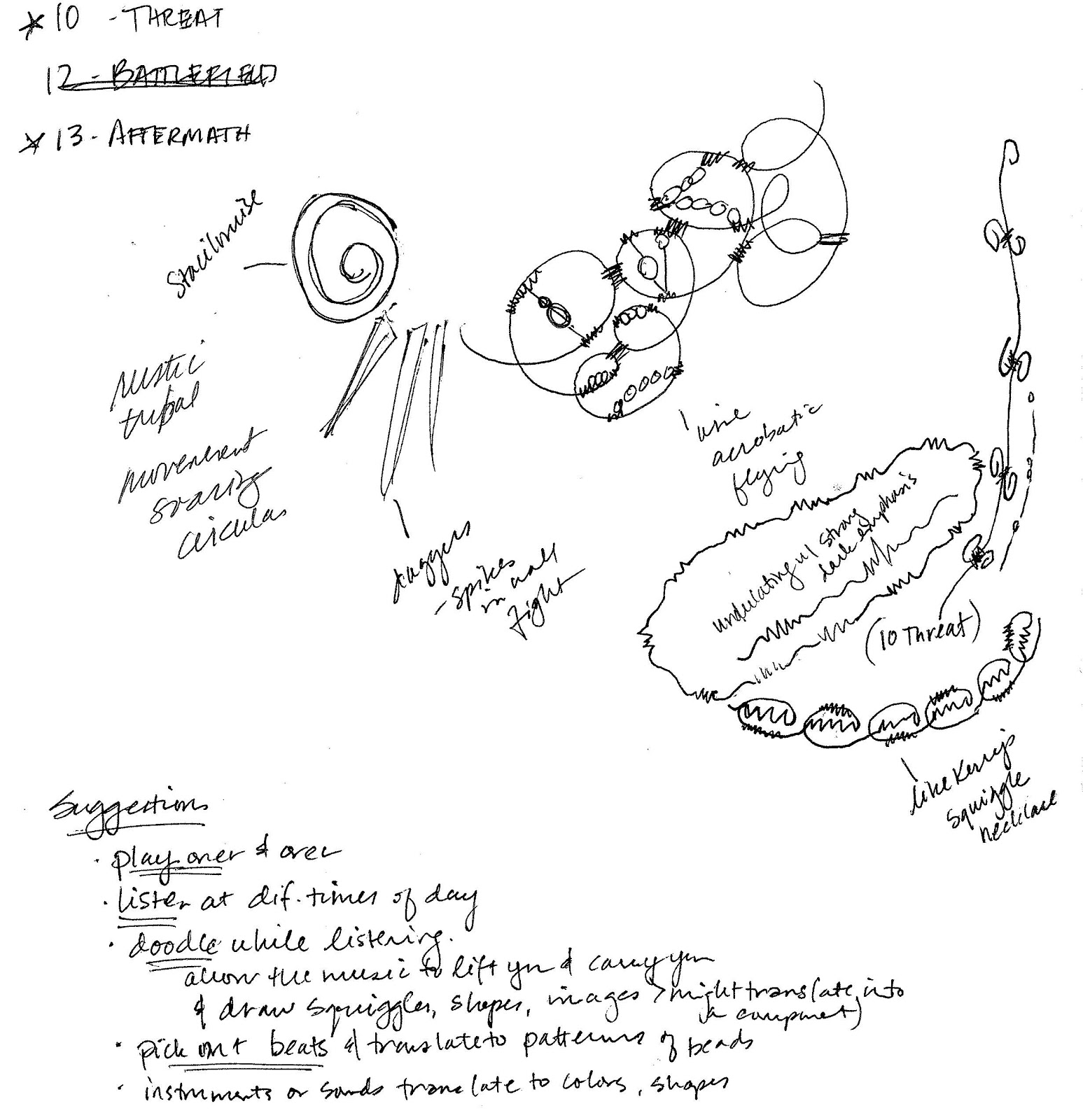 | My doodles and notes after listening to several songs I am considering |