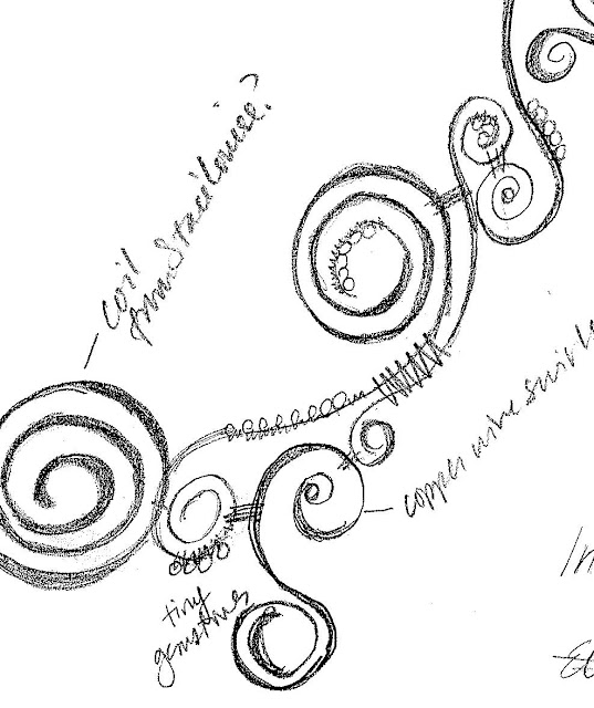 Then, with pen and paper, doodle while you listen. Fill an entire page with shapes and lines and squiggles. It doesn’t have to resemble anything that you will create and you don’t need to be a great artist. Just make marks on the page. You might be surprised to find repeating patterns relating to the rhythm or sound of certain instruments. Set that aside and come back to it later. You might be able to translate one of your doodles into a shape you can create with wire, or beads, or fiber in your work.