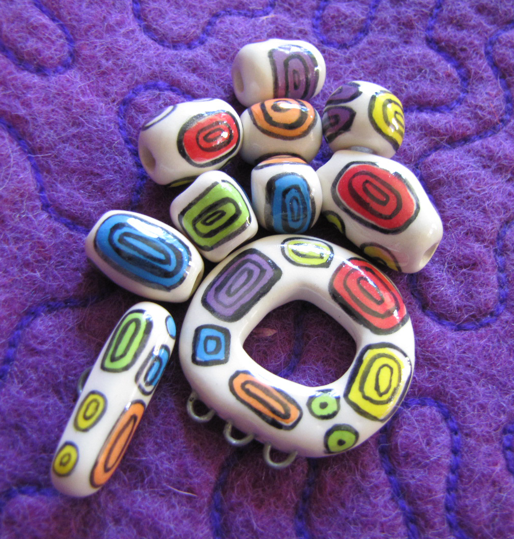 Tari Sasser of Creative Impressions In Clay is donating a toggle and bead set, made just for this month’s challenge. In her normal style, Tari painted the beads and toggle set with brightly colored underglazes.