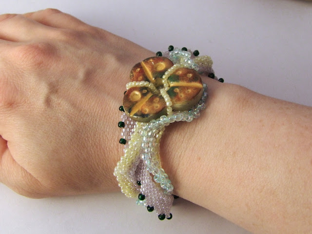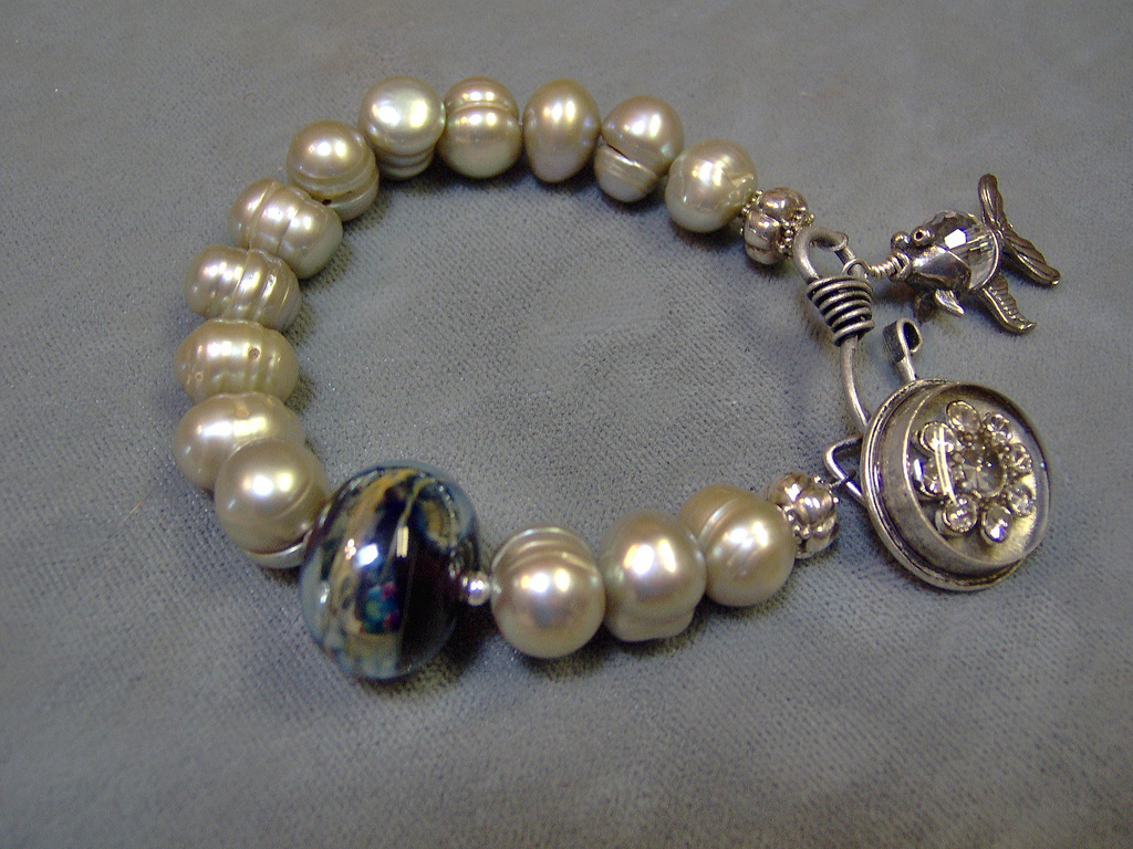 Pam of Klassy Joolz (above) made the most delightful bracelet for the challenge. The soft white clouds meeting the swirling blue sea are so soothing. And the unexpected delight is that wee little fish dangle that makes me smile!