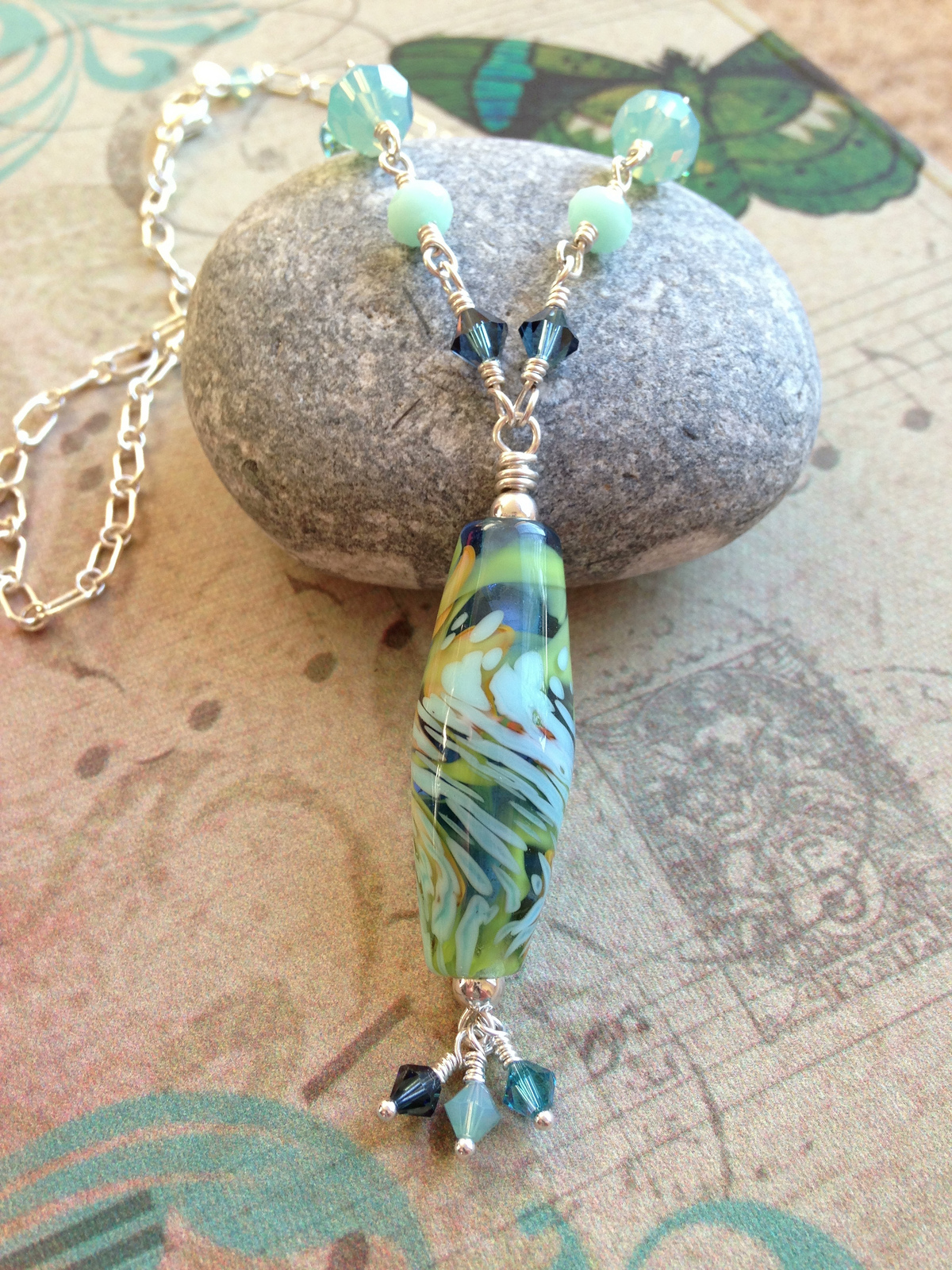 Lampwork beads fascinate me. I am not sure how those artists and wrangle a flame and spears of glass into gorgeous landscapes, but I am so glad they do! There is some serious magic happening in this bead that SaraJo Wentling found. Look! There is a whole world inside of it! And a world that lives at the beach is my kind of world! Check it out at SJ Designs Jewelry.