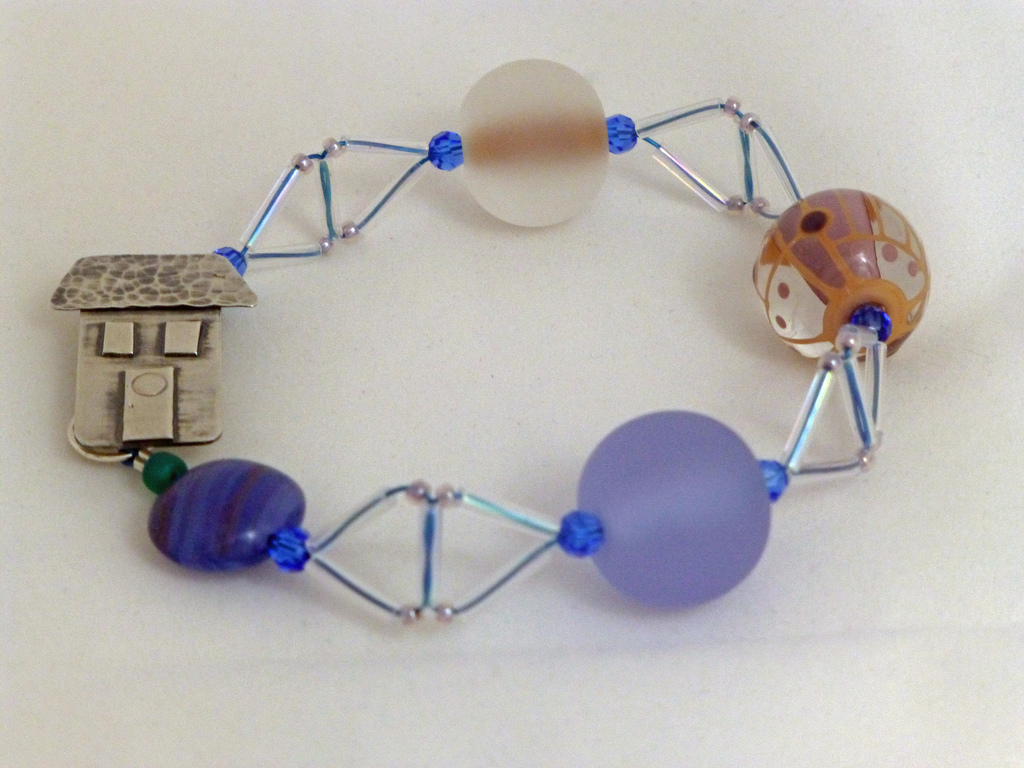 Let’s kick things off with a design by our own ABS Adminstrator, Heather Powers! This necklace (above) has the perfect blend of beachy themed beads like urchins and shells along with a summer palette of teals and tans and a sweet little house bead tucked right in!