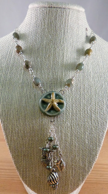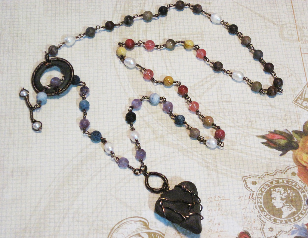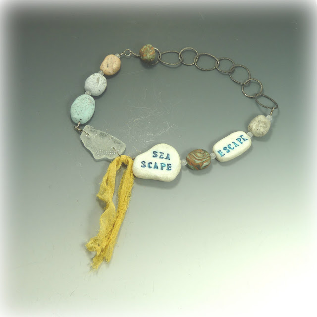 Jen of Purple Fish Studios (above) finds that there is a great similarity with seaside towns no matter where they are. Her necklace features a rare basalt heart stone added to a pretty array of wired stones and a handmade clay and wire coiled clasp. This is truly a memory of a fine vacation along the coast!