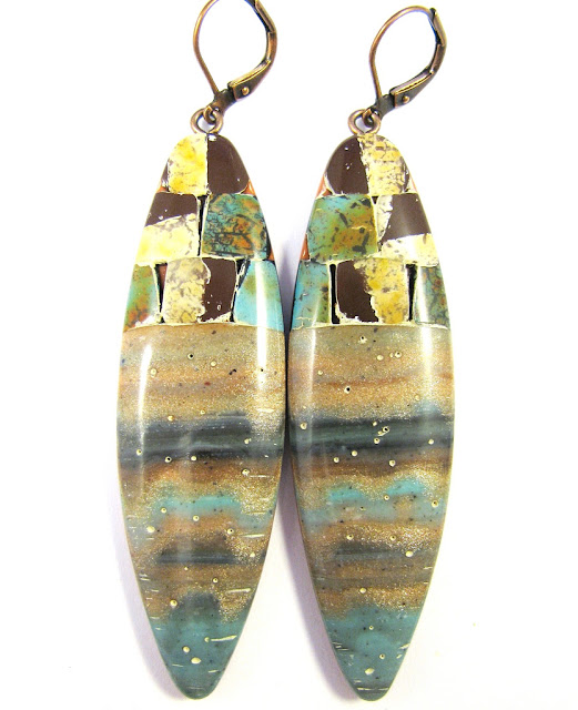 Wow. There is nothing that I can say to top these delightful earrings! Miss Lynda (above) makes the most incredible polymer clay creations look so easy, when I know that they are far more intricate than you would think. Her use of color and pattern and texture is truly masterful. These look like the striations of stone on the craggy rocks where this little town is perched. And the mosaic reminds me of how these houses are likely built of the stone on which they rest. So wonderful. Read all about it at SC Diva.