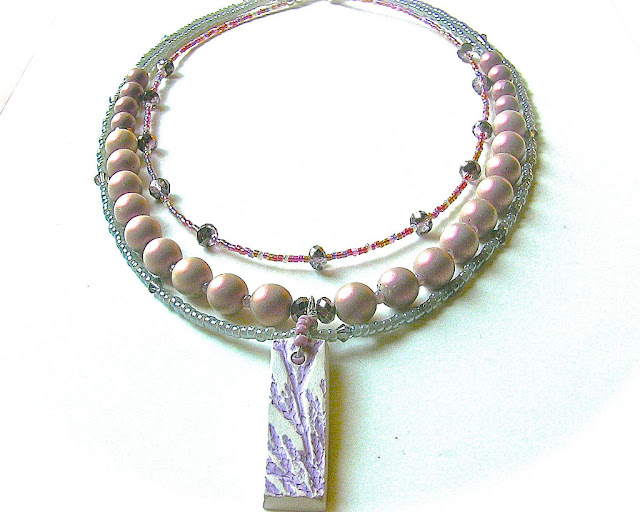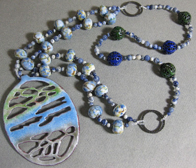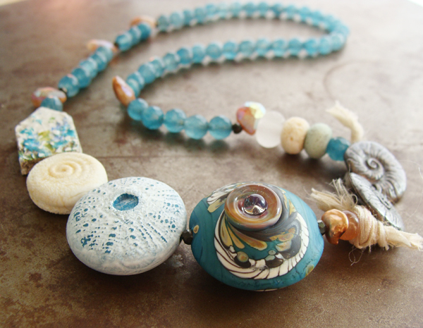Kathy of Bay Moon Designs (above) was inspired by the sky and the sea with her soft, ethereal color palette. The mix of shapes and multi-strand design give this a refined edge while the art bead pendant lends it a bohemian feel. Such a soothing design!