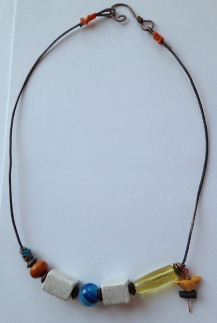 This necklace is island living at it’s finest… a lazy day filled with sun and heat makes you want to pare down to the bare essentials. It is incredible how deep you can get with a handful of treasured beads and some simple leather cord! I love the abstract quality of these beads and how they relate to the painting… the houses, the sea, the sky. Read more of this design by Ann at Bead Love.