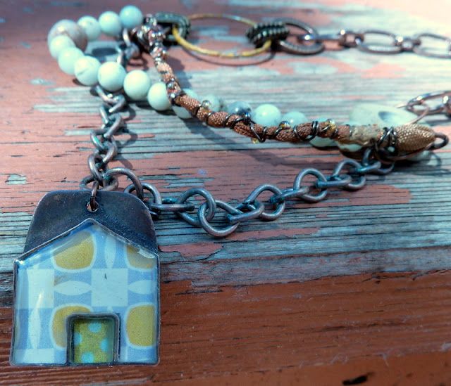 I love the laid-back easy feel of this necklace (above). The rope reminds me of boat riggings, the jagged stones look like the island and the rocks and the wee little house makes me wish I were right there on the edge of the sea. Read more of the inspiration for this necklace by Leah at Beady Eyed Bunny.