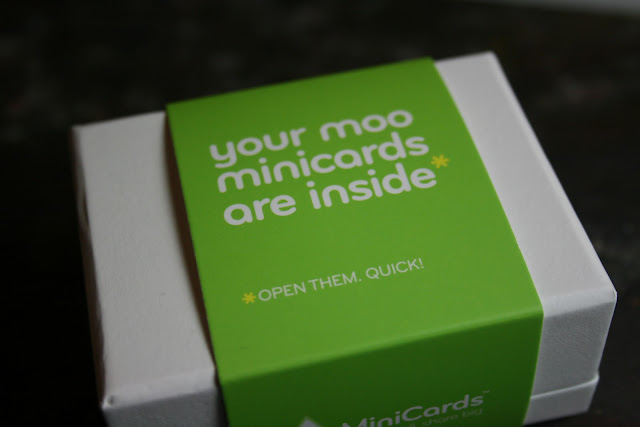 Moo cards are the absolutely best quality that I have ever found, and I love the mini Moos most of all. Their small size makes them like bubble gum trading cards and their silky feel, awesome color printing and the ability to make up to 100 designs in each pack is incredible. (Please note that I do not get paid from Moo to say this. I just like them that much!)