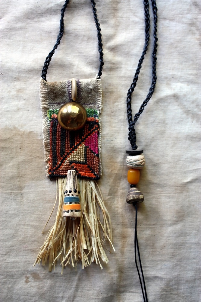 There is a certain peaceful simplicity in everything that Miss Dawn of LaTouchables makes. I always stand in awe. I aspire to have this level of confidence in my own voice. Her pieces always sing, and the song seems to come from a deeper place, one that is ancient and timeless and mystical. I am fascinated with the way she plays with fibers, old pieces of fabric, rough pieces of raffia, tiny stitched embellishments and a hand-crocheted cord to tie it all together. The colors are at once muted and yet vibrant in their juxtaposition. She chooses her beads wisely with an eye of a curator. I love that she chose NOT to make this a literal interpretation. There isn’t a shell to be found in here. Yet, it embodies shamanistic qualities that feel as ancient as the sea with a wisdom of the ages in that tiny pouch.