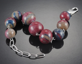 I love that he’s making beautiful beads out of a recycled material, and an unusual one at that. I also love his attention to detail. I love how some of his recycled bowling ball jewelry looks like miniature bowling balls! Imagine showing up on league night with these dangling from your ears! You’d think they’d be heavy, but once cut down to bead size, they’re incredibly lightweight.