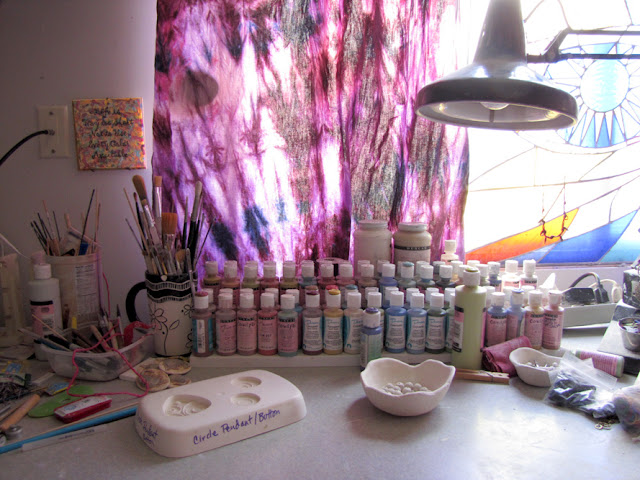 The counter where I make and glaze buttons. Wow, who lined up those glaze bottles!