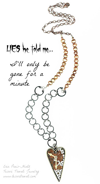 I saw a post that Brenda Schweder had on her Facebook page about a bit of rust she picked up in a parking lot. Coincidentally, I had found the same piece from my own rust farm (i.e. van). She proposed that we make something and share it. I accepted the challenge. This led to the creation of a new series I am exploring called “LIES They Told Me.” That afternoon I met a local boutique owner who was impressed by the story and has asked me to add to this collection and sell it in her shop, so now I need to work on that!