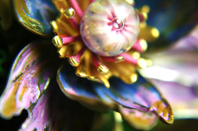 I was honored to be selected to participate in the Art Jewelry Elements Component of the Month challenge. Jennifer Cameron of Glass Addictions created murrini glass headpins and sent me two. I made a flower bloom cuff bracelet for a corsage that will never fade. You can see more of this design on my post Bursting Forth.