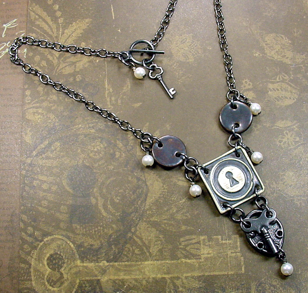 I was so excited to get these four hole keyhole links out of the kiln, I immediately whipped up this necklace with gunmetal, Tierracast pewter, and glass pearls. The gunmetal finishes and the dark metallic pewter glaze really compliment each other well, I think!