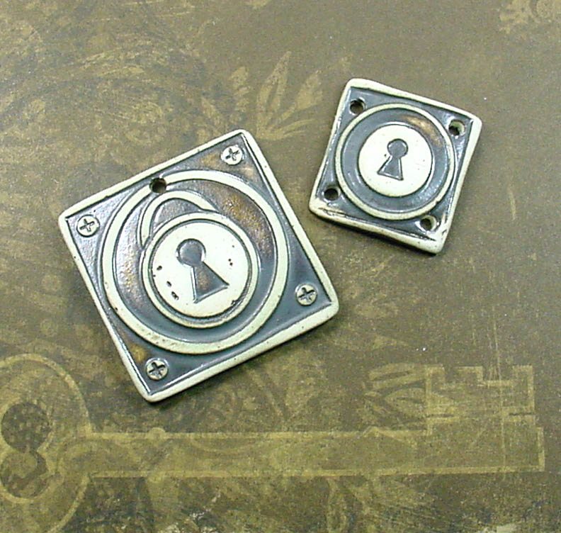 I have been working on some new designs lately that are based on hardware, things like locks and keys. I seem to balance my designs between images that are organic and images that have a harder edge to them. I have been enjoying designs that are somewhat more masculine and industrial lately. My technique is to do a drawing (or in this case, a computer designed image) and have a rubber stamp made from my design. This technique works really well with my ceramic clay slab roller and porcelain clay, because I can stamp many pieces at once and get a nice, clean image that was easy to create!