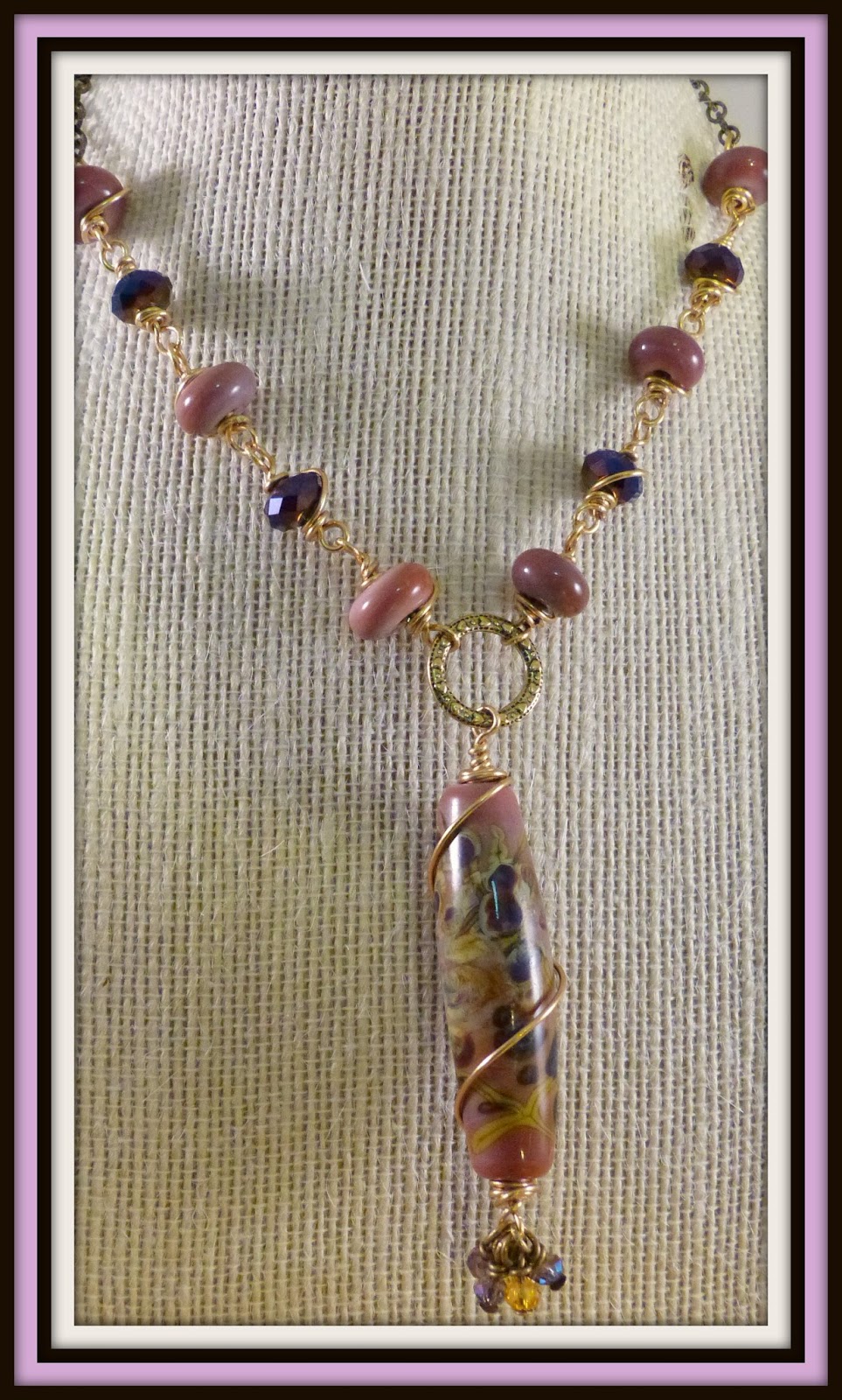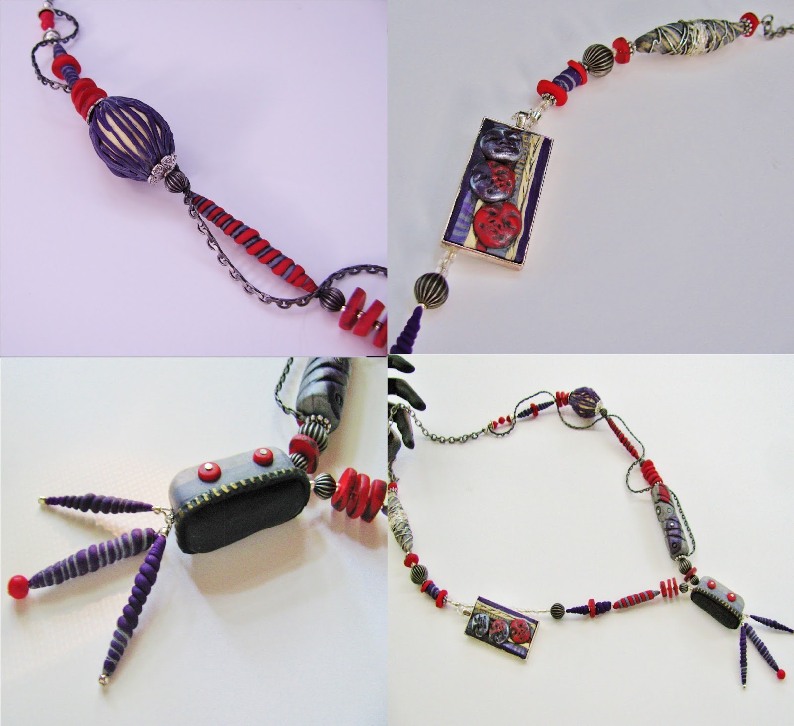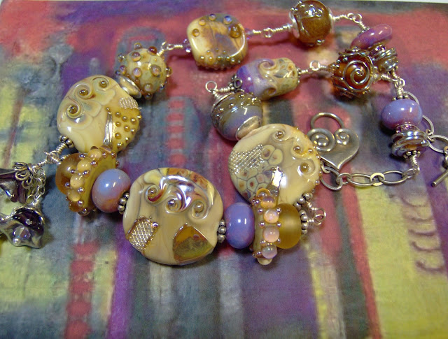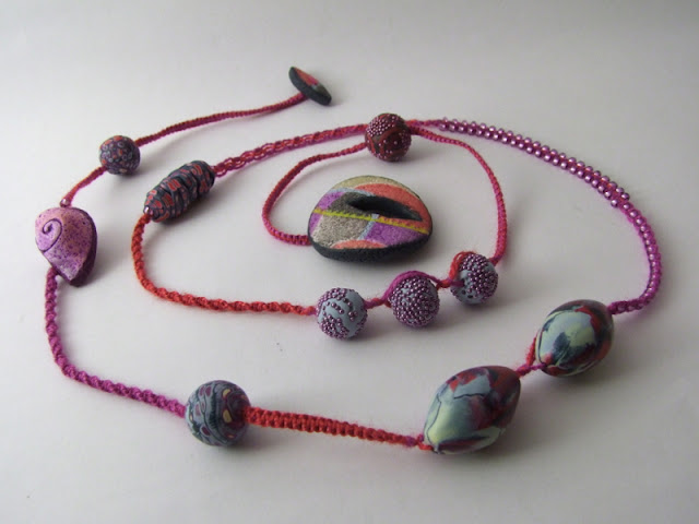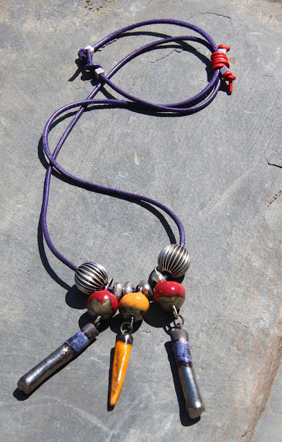 I find it wonderful serendipity when I happen to have the very thing in my stash that represent the painting. Miss Karin all the way over in France has been amassing quite a wonderful hoard of art beads and had these beauties and that perfect shade of purple leather cord just lurking around! Read more on her blog, Gingko et Coquelicot.