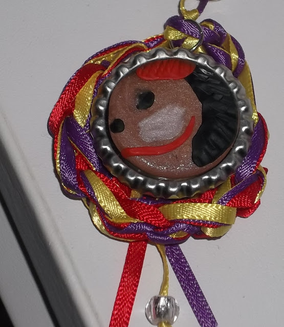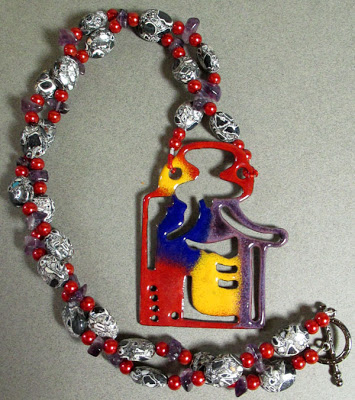 The abstract figures in the painting reminded Miss Beth and her mom Miss Evie of space invaders! They created this remarkable focal from the actual images in the painting and show us their sketches that turned into reality on their blog, EB Bead & Metal Works.