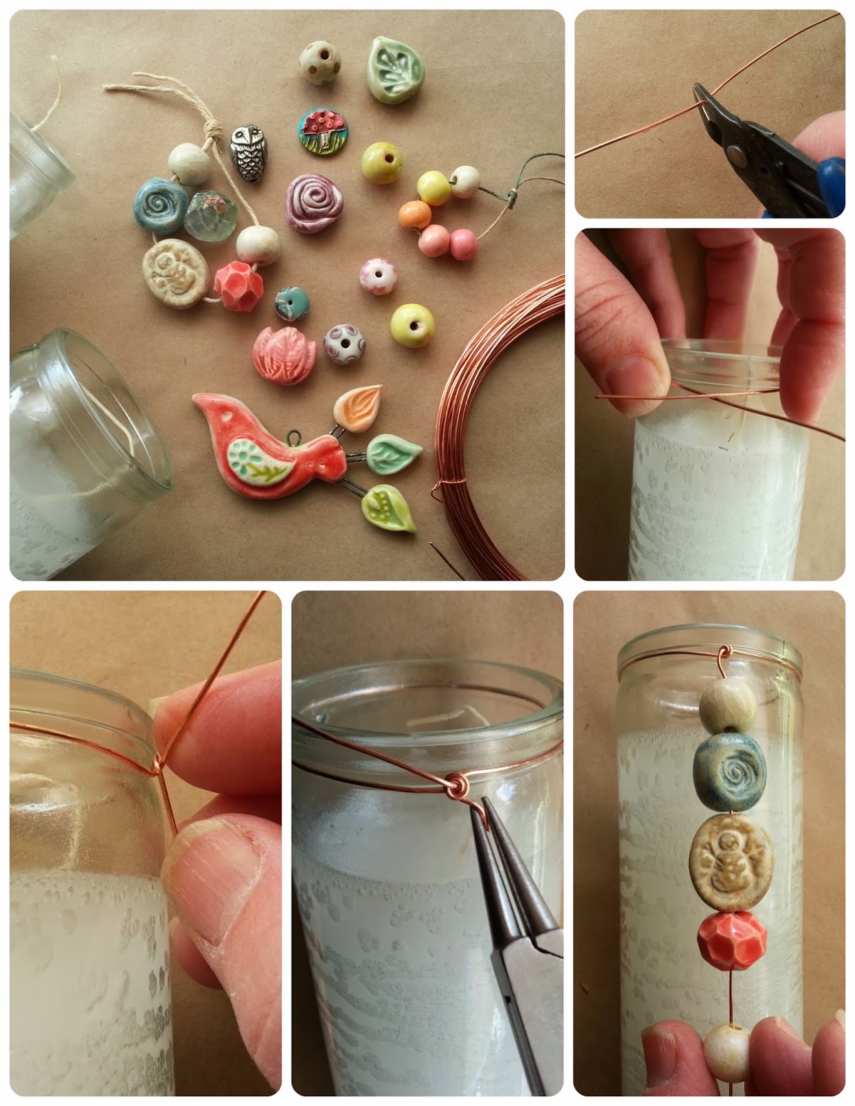 Holly Pendant Supplies: Ceramic Holly Pendant 4 assorted red and green accent beads 2 brass 2 inch headpins 1 10mm brass jump ring 1 brass chain necklace Instructions: 1. String a…