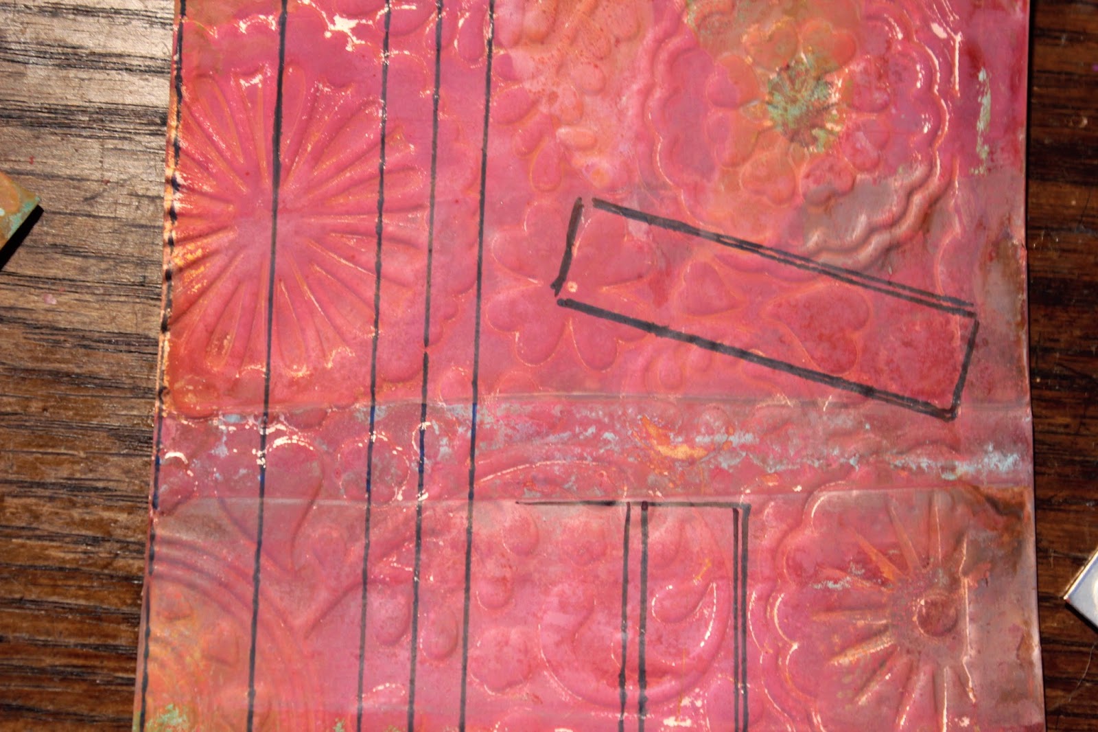 You don’t want to know how I’ve been cutting down my metal sheet. Okay maybe now that I’ve said that you do. I’ll share my dirty little secret with you …. but please keep it to yourself, I’m a little embarassed to let this secret out … I’ve gone from using metal cutting shears (not so bad but awkward on large sheets) to using a paper cutter (gasp!). An old fashioned paper cutter actually worked. I don’t suggest trying this method at home as it does have its drawbacks which I’m not going to go into now but I’ll repeat that I don’t recommend trying that method at home.