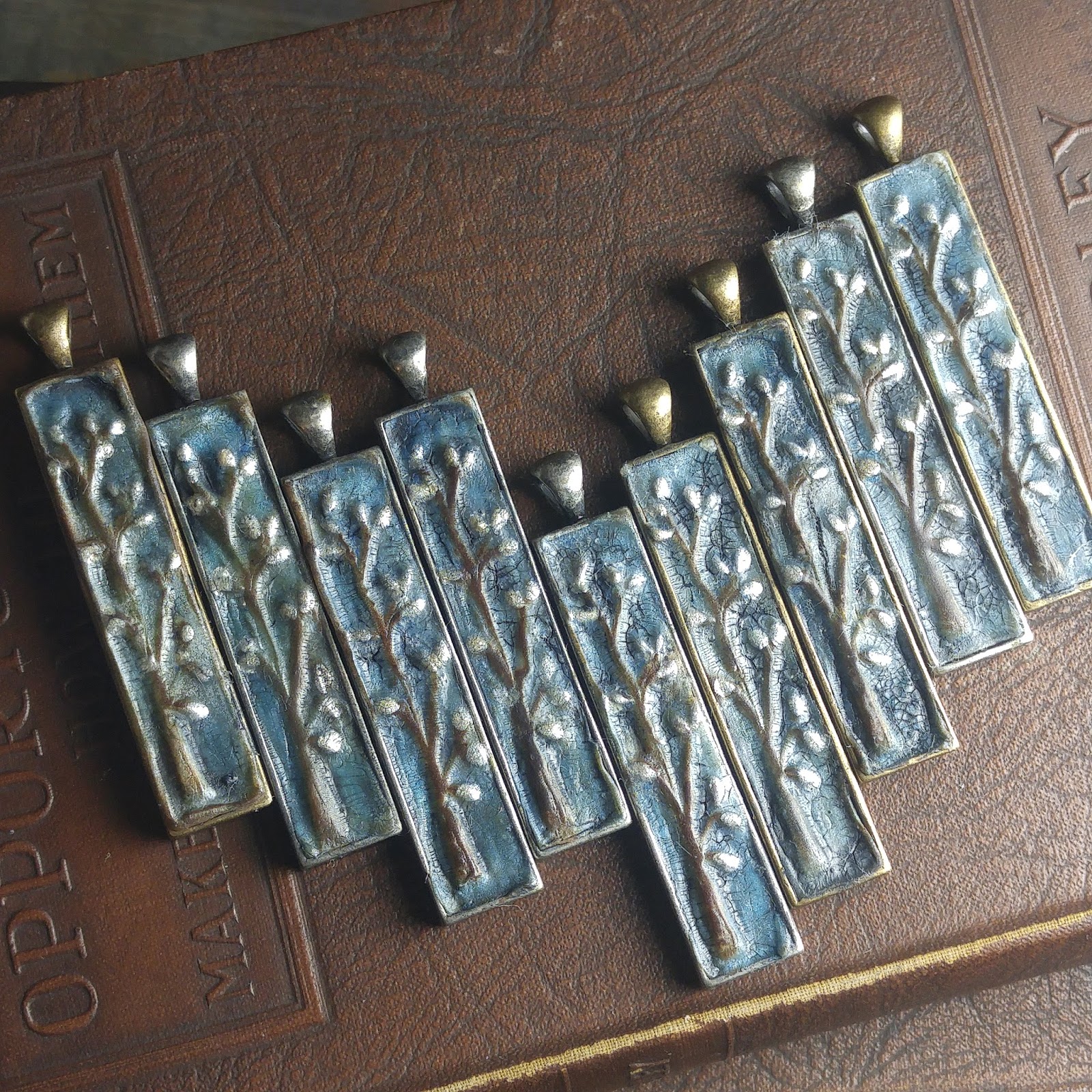 I knew that I wanted to revisit that image, but with a twist… I was following a tutorial on how to make a sort of faux ceramic look with polymer clay using inclusions in the clay, chalk pastels and a crackle medium. It called for making your own mold of sorts, so I carved a piece of scrap clay and baked it. That way I would be able to replicate this look. Impressing the mold onto the clay in the bezels resulted in the “outy” look that I was hoping for. I colored the clay with the chalks and used a little bit of Lumiere pearl paint to make those catkins glow.
