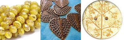 Not ready to give up the sunshine? Here are some harvest gold glass beads from BobbiThisnThat. They say charm bracelet to me paired up with a collection of copper filigree leaves from ArtfulMarket. And the clasp? Why, an oregano leaf button from Creative Impressions in Clay.
